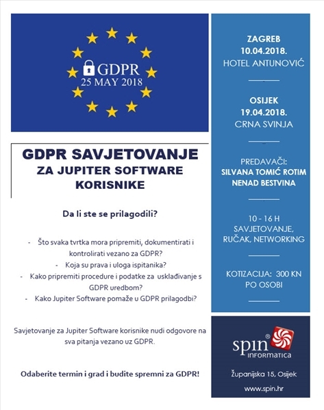 Spin je za svoje klijente priredio dva savjetovanja. Prvo će se održati 10. travnja u Zagrebu u Hotelu Antunović, a drugo je na rasporedu 19. travnja u Čepinu u restoranu Crna Svinja. O GDPR-u i integraciji rješenja u Jupiter Software govorit će Silvana Tomić – Rotim i Nenad Bestvina, a oba će savjetovanja trajati od 10 do 16 sati. Cijena kotizacije je 300 kuna, a u nju je uz savjetovanje uključen i ručak.